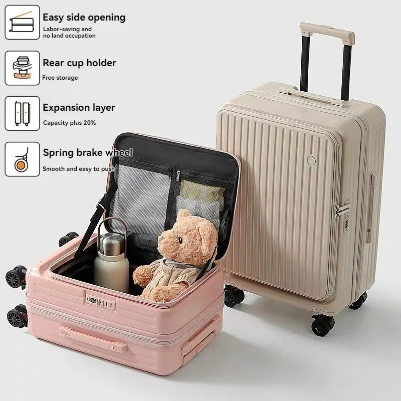 Valises bagages ouverture avant cabine bagages avec USB porte-gobelet femme boîtier de chariot mâle roue de frein sac de voyage bagages