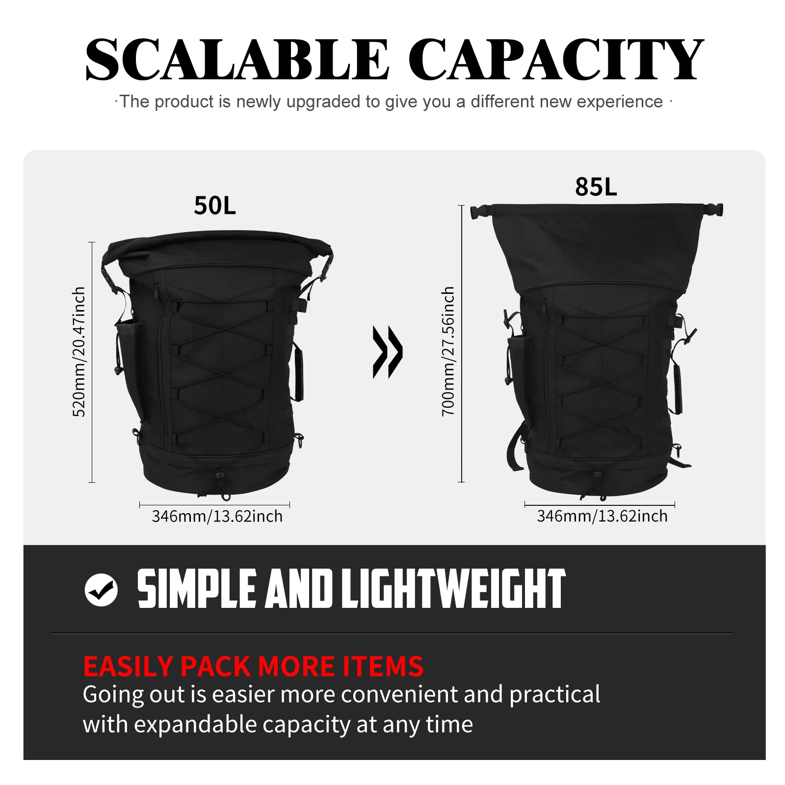 - Grande capacité de 50L à 85L pour ranger de nombreux effets personnels