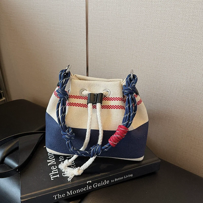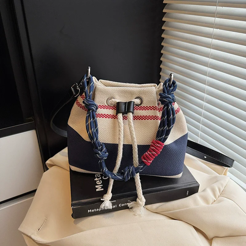 Sacs seau en toile, sac à main seau pour femmes, nouvelle mode rétro d’été pour loisirs, sac à bandoulière asymétrique épaule dénudée