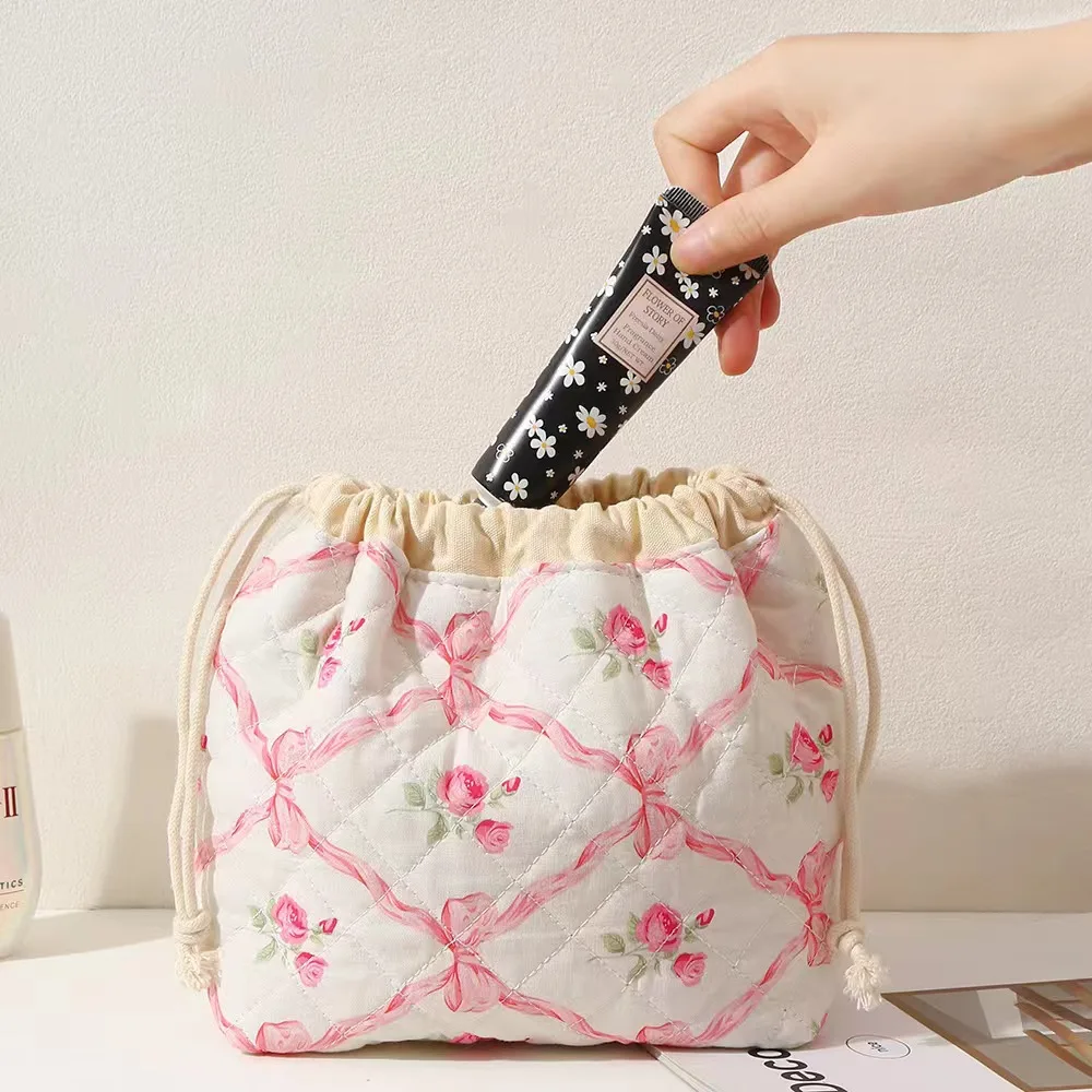 Trousse de maquillage matelassée, trousse à cosmétiques florale, trousse de toilette de voyage mignonne, pochette à cordon esthétique douce rembourrée pour femmes et filles
