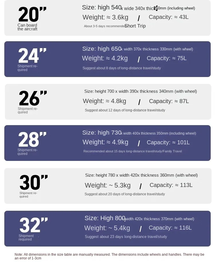 | Taille des bagages | 24 inches, 26 inches, 28 inches, 30 inches, 32 inches |