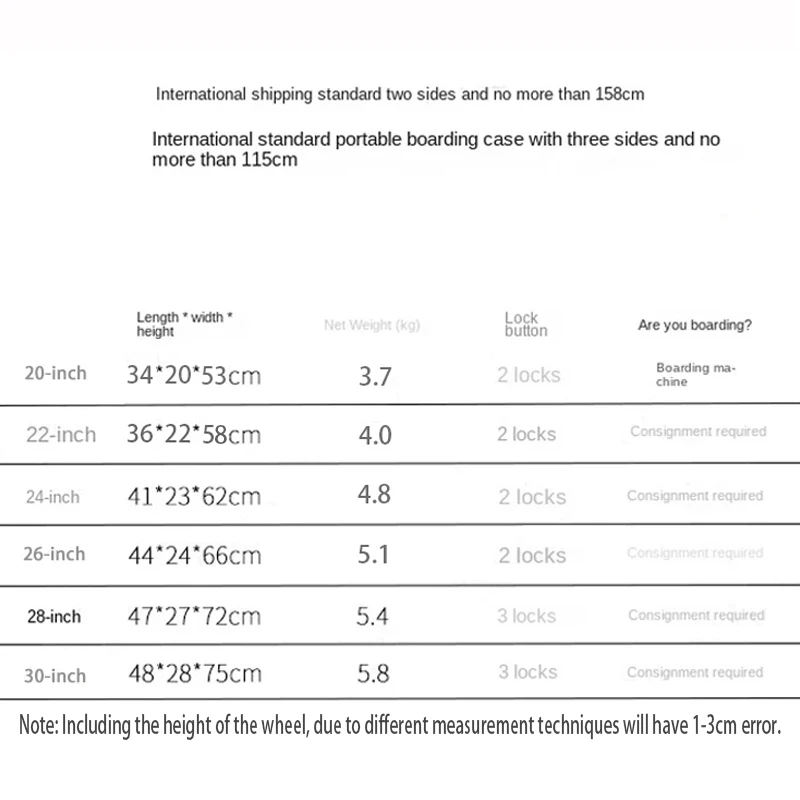 | Taille des bagages | 20 inch, 22 inch, 24 inch, 26 inch, 28 inch, 30 inch |